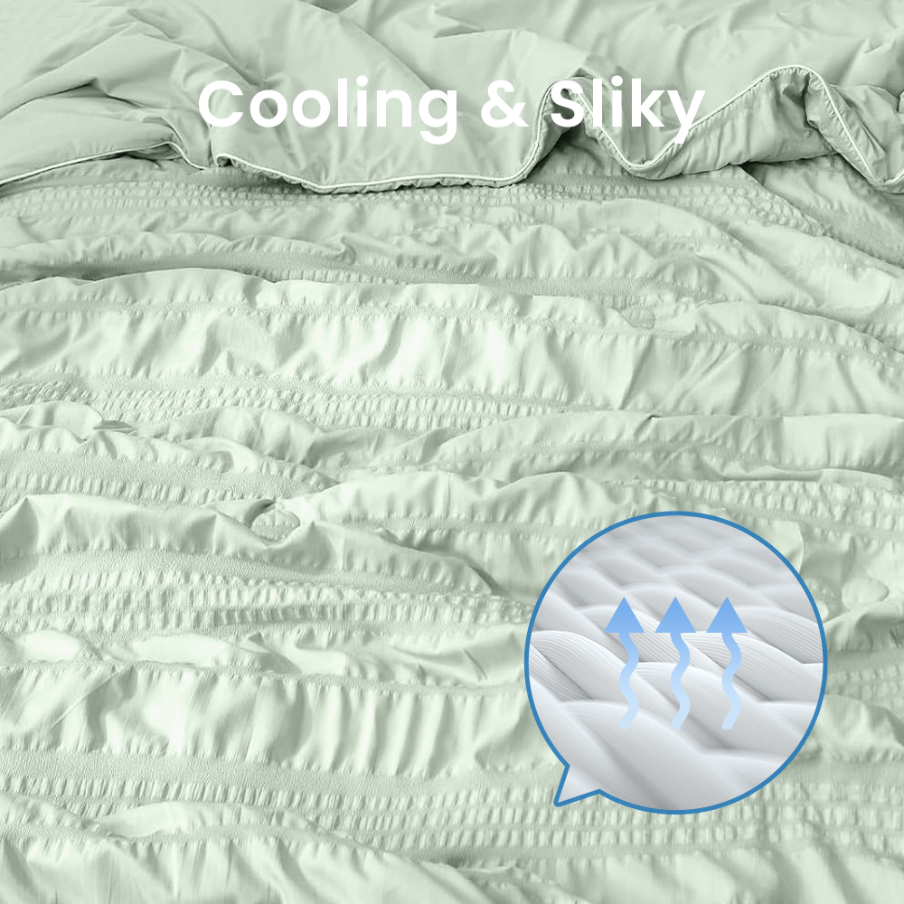 ❄️ HOZTU AZKAR: Cozy Bliss Seersucker Cooling Comforter punta-puntako japoniar Arc-Chill hozte-ehunarekin diseinatuta dago, Q-Max altua (> 0,4) duena. Teknologia berritzaile honek gorputzeko beroa eraginkortasunez xurgatzen du, hezetasunaren lurrunketa bizkortzen du eta azalaren tenperatura 2 eta 5 ℃ artean jaisten du, lo freskagarri eta erosoa eskainiz, batez ere bero egiten dutenentzat.